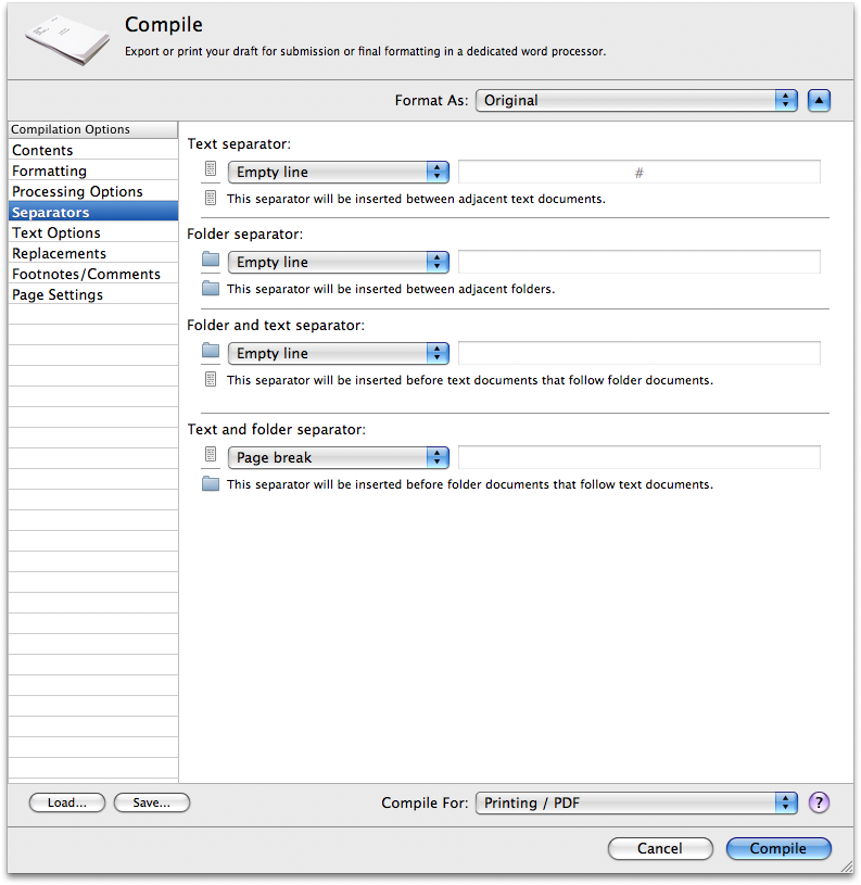 Finally, use the Compile For popup at the bottom of the dialogue box to select your output format. This will be either personal preference, or editorial requirement. Some people will prefer going straight to PDF, some will want RTF, others will have to provide a Word doc, or whatever. Personally I recommend RTF over Word docs – RTFs can still be opened in Word, but give a more accurate reproduction of page formatting across platforms.