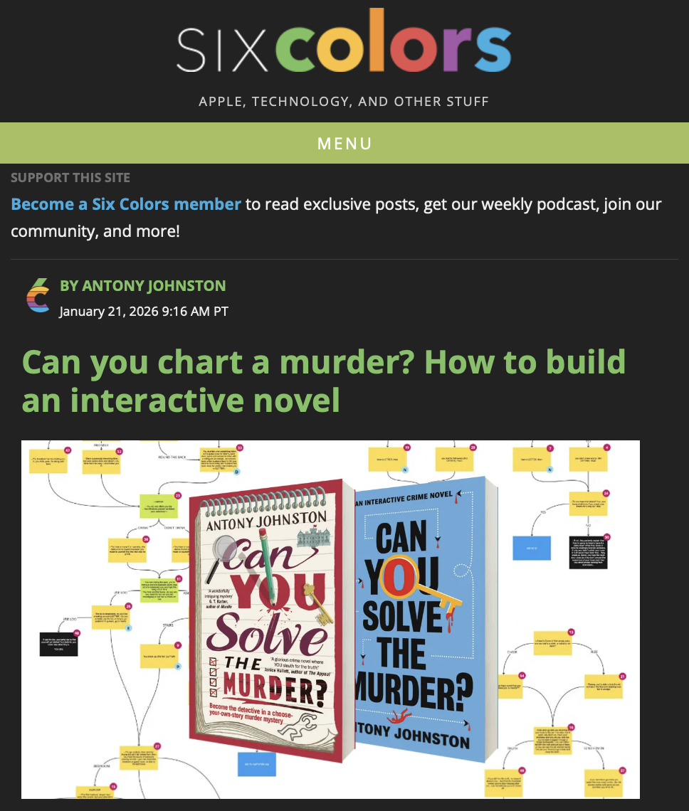 In this piece for the tech website Six Colors I explain my methods for doing so, the game mechanics I designed to enable traditional mystery elements such as clues and red herrings, and the software tools I use to design the branching narrative.