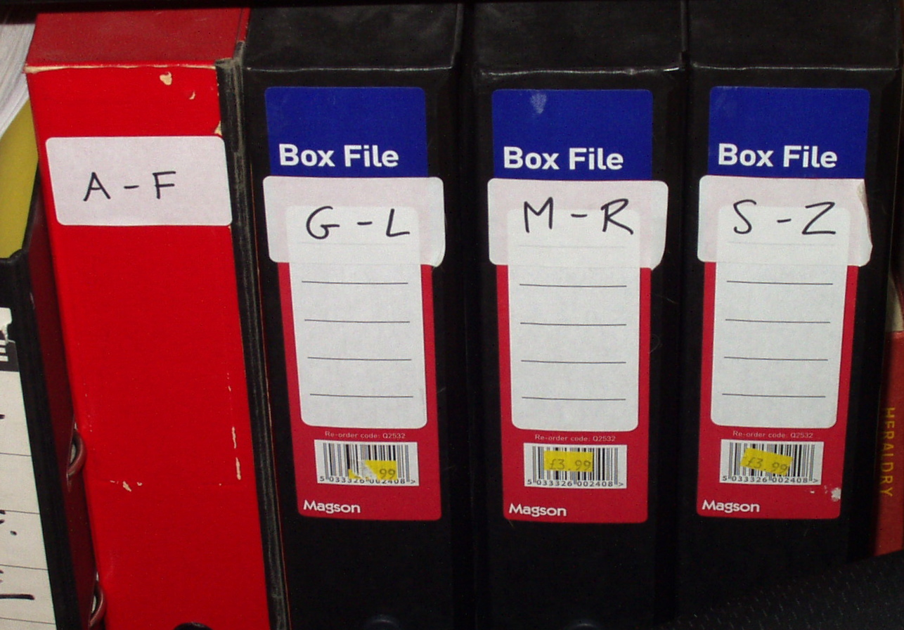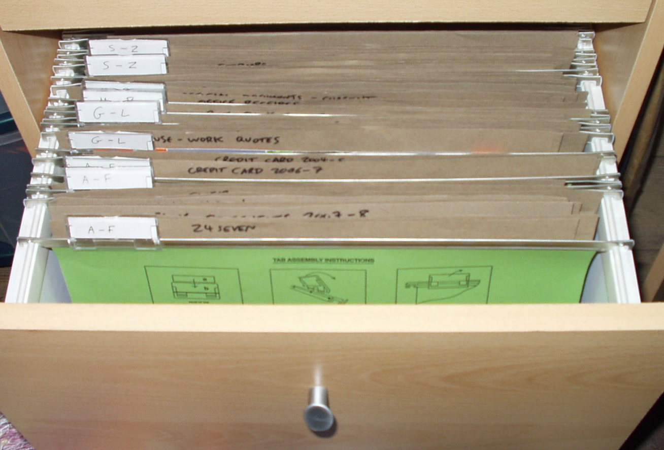 When a file gets old enough, or if I know I won't need to refer to it much, it gets moved to the file storage boxes at the bottom of a bookshelf. They're also in alphabetical order, currently covering A-F, G-L, M-R, S-Z. But that's entirely arbitrary, to fit the spread of folders particular to me. If I had my druthers (and an office five times as big), I'd have a single box for each letter of the alphabet. So find the spread that works for you, and don't be afraid to change it over time if necessary.