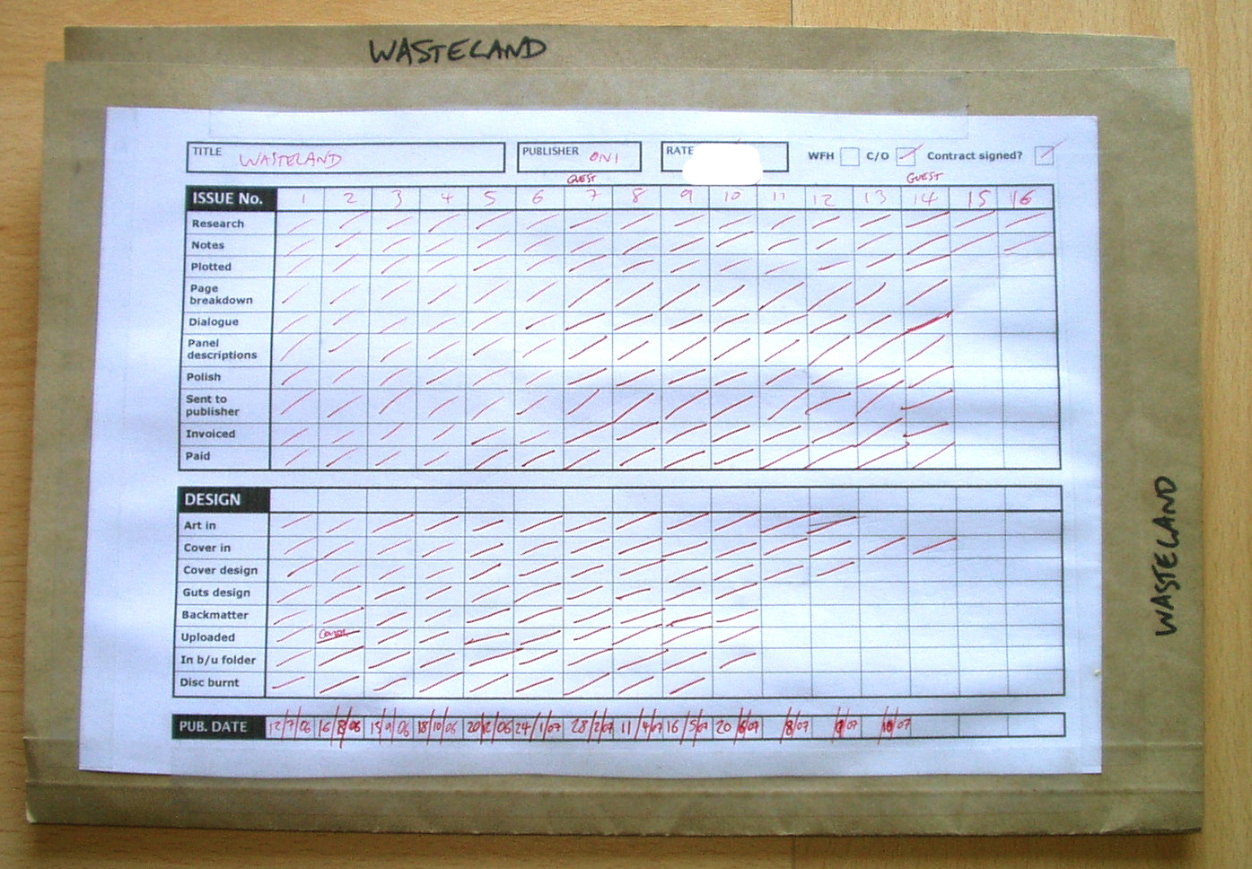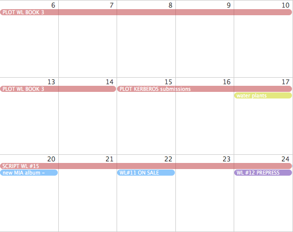 When I picked up the Wasteland folder in the first week of that Calendar screenshot above, I could immediately see that all plotting and scripting up to issue #14 was done; that I've been paid for it; and that research and notes were completed for #15, but Plotted (the next task for that issue) was still unchecked.
