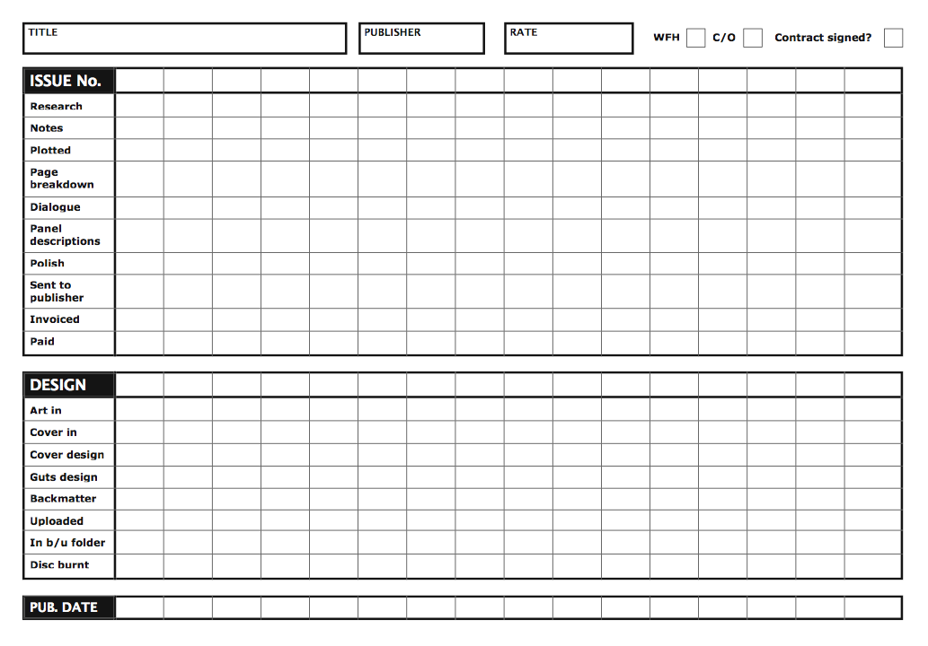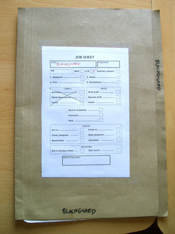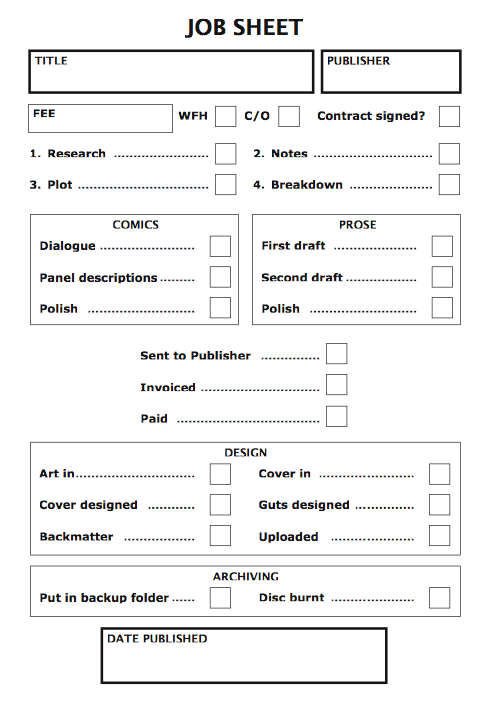This is my basic, single-work job sheet. It should be pretty self-explanatory – I fill in stuff like Title and Publisher right at the start, then tick off the boxes as I progress through the project. Because I design a lot of my own books, there's even a section for that at the end, too. If it's a comic, I strike through the Prose section near the top; and vice-versa for prose work.